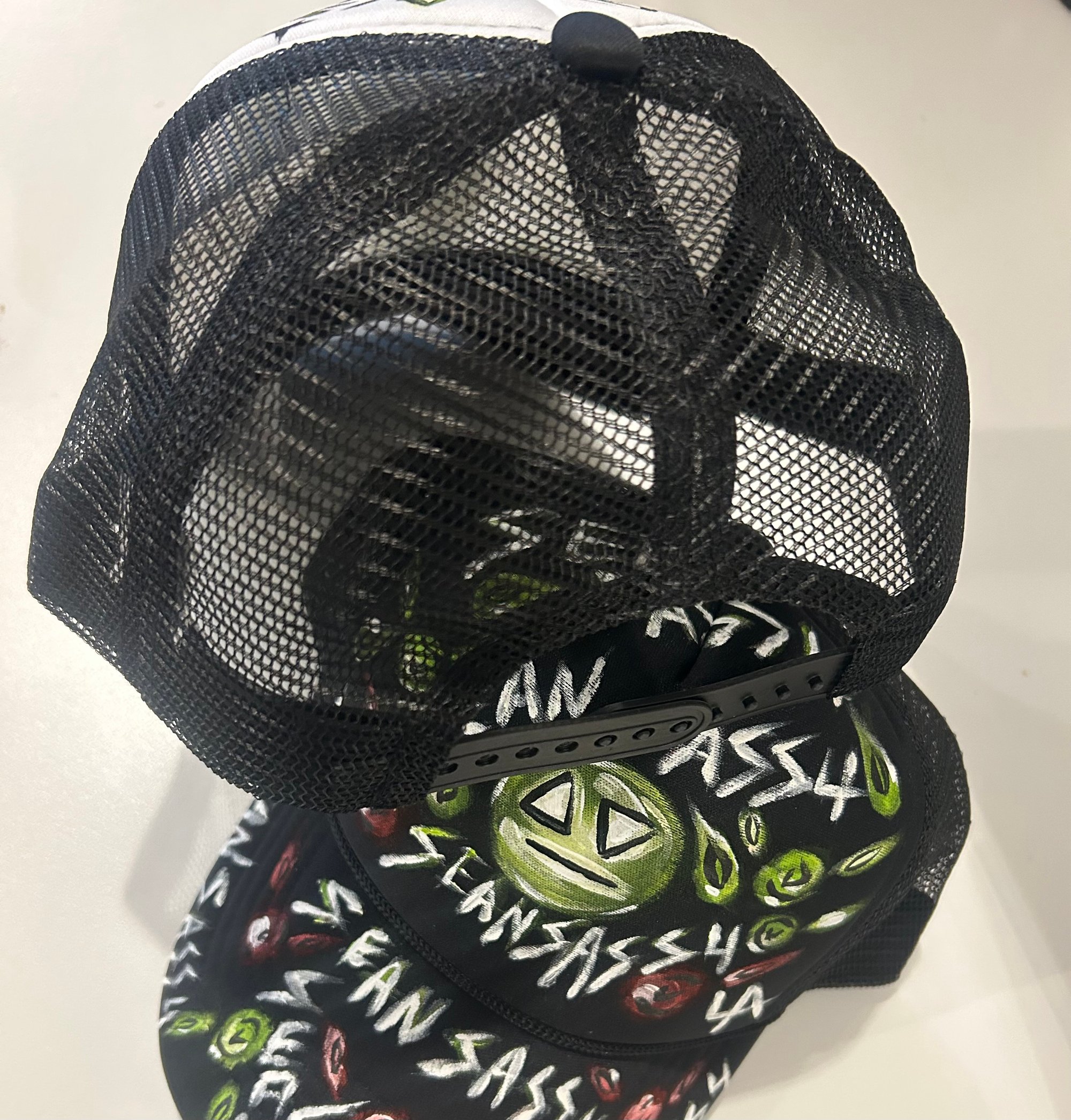 Hand painting trucker hat by Sean Sassu aka Fella